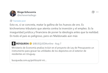 Pour leur part, les représentants du secteur financier et des entreprises se sont exprimés à l'idée de l'effet expulsif possible du capital et des avertissements sur la prévisibilité fiscale. Le président de la Chambre des services financiers de l'Uruguay, Pablo Montaldo, a expliqué auparavant Canal 12 Que la décision pourrait encourager le transfert des investissements aux juridictions étrangères, rendant l'inspection budgétaire difficile et générant un éventuel découragement pour maintenir de grands actifs dans le pays. Le député Diego Echeverría a averti que la seule discussion sur la taxe représente «un coup» à la certitude pour ceux qui ont choisi de s'installer dans des endroits comme Maldonado, et ont mis en garde contre l'effet possible de la perte de crédibilité et de l'emploi local en assimilant la mesure aux politiques fiscales des pays voisins.